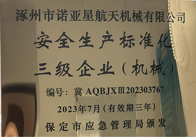 2023年6月13日,受河北省應(yīng)急管理局委托,保定市應(yīng)急管理局、涿州市應(yīng)急管理局和保定安泰評價(jià)有限公司組成專家組,對涿州市諾亞星航天機(jī)械有限公司三級安全標(biāo)準(zhǔn)化達(dá)標(biāo)進(jìn)行了評審和驗(yàn)收。經(jīng)過為期一天的檢查驗(yàn)收,公司順利通過“安全生產(chǎn)標(biāo)準(zhǔn)化三級達(dá)標(biāo)企業(yè)”評審。